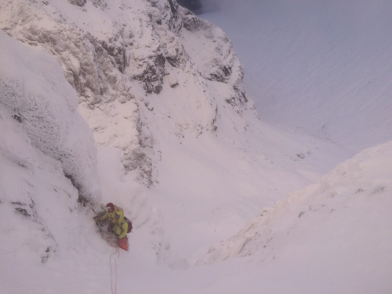 Earlier in the week I climbed in Coire an t-Sneachda and ended up on a very cold and snowy ‘Pot of Gold’ on the Mess of Pottage. The Cairngorms (like the west) have had considerable snowfall above about 600m on and off throughout the last 10 days. Add to this strong wind of variable direction moving the snow around creating cross-loading on many slopes and the result has been a continually changing avalanche forecast. The persistent cold temperatures are doing nothing to help transform the snow to ice and for climbing conditions to improve a thaw and refreeze is badly needed. The forecasts for next week are at this stage conflicting, however a mid-week thaw looks likely across all mountain areas so we will have to wait and see what happens. Climbing in the Corries was best described as cold, hard work with lots of digging to get into and up routes. That said the skiing has been amazing with a lot of touring happing on the plateau along with descents of many of the couloirs and the same over into the Loch Avon basin and beyond.