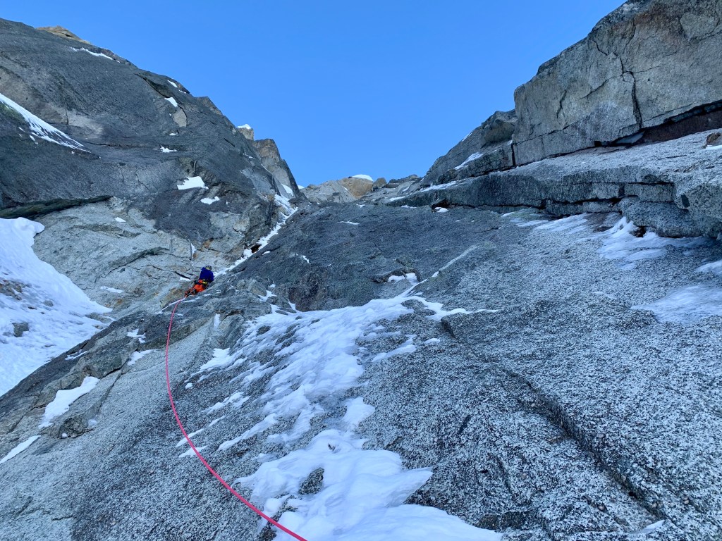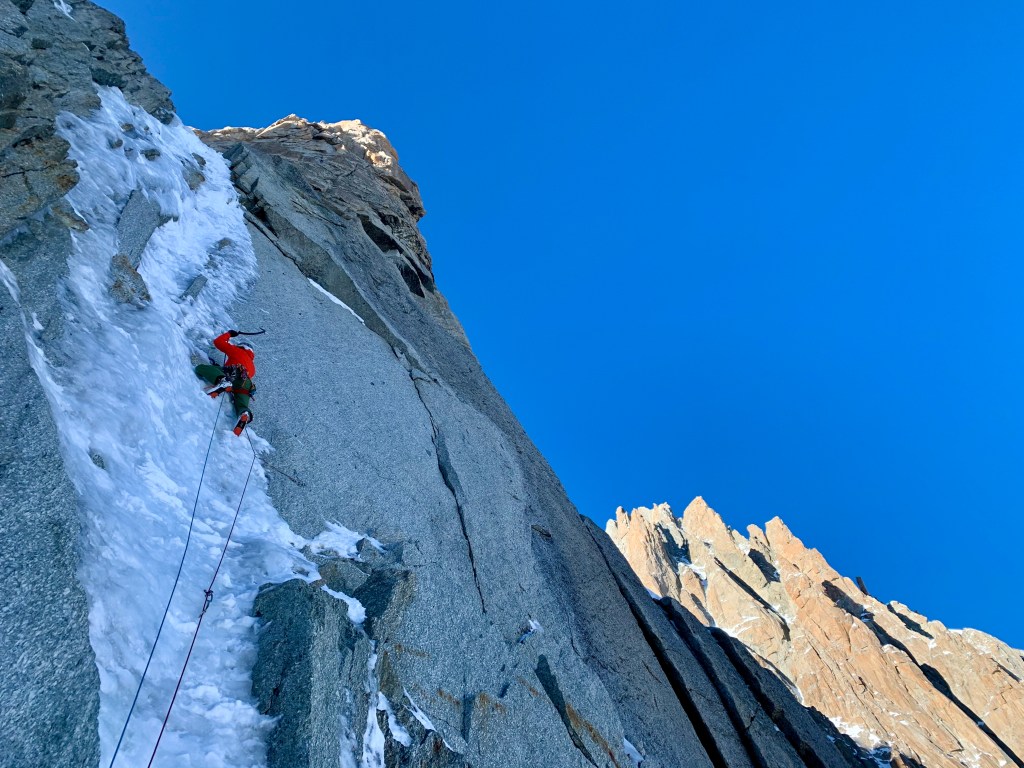 The route was in fantastic condition and was clearly a very different experience for us than the first ascensionists. The climbing was nothing harder than some cruisy Scottish VI climbing, really good fun and an impeccable line, quite possibly the best mixed route I have done in the massif. It is important to note that as we did not climb the top 3 pitches (they were all looking very dry) we cannot claim a true ascent. Essentially we climbed the meat of the route and had a superb, fun day out as mates and one that I will remember for a long time. It being my first day out this winter there was a lot to get back into the swing of, not least the ski back down from the route to town in the dark with big bags on and no ski legs! Chamonix style day-hitting at its finest and as strong a start to the season as I could have hoped for.